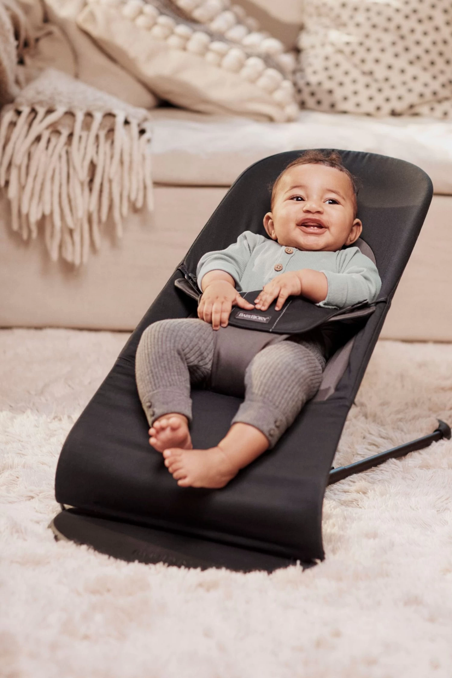 Bouncer Balance Soft can be used from newborn and up to the age of 2 years. In the early months, until your baby starts trying to sit up, you can use it as a bouncer. You can then use the bouncer as a comfortable child seat by simply reversing the fabric seat.