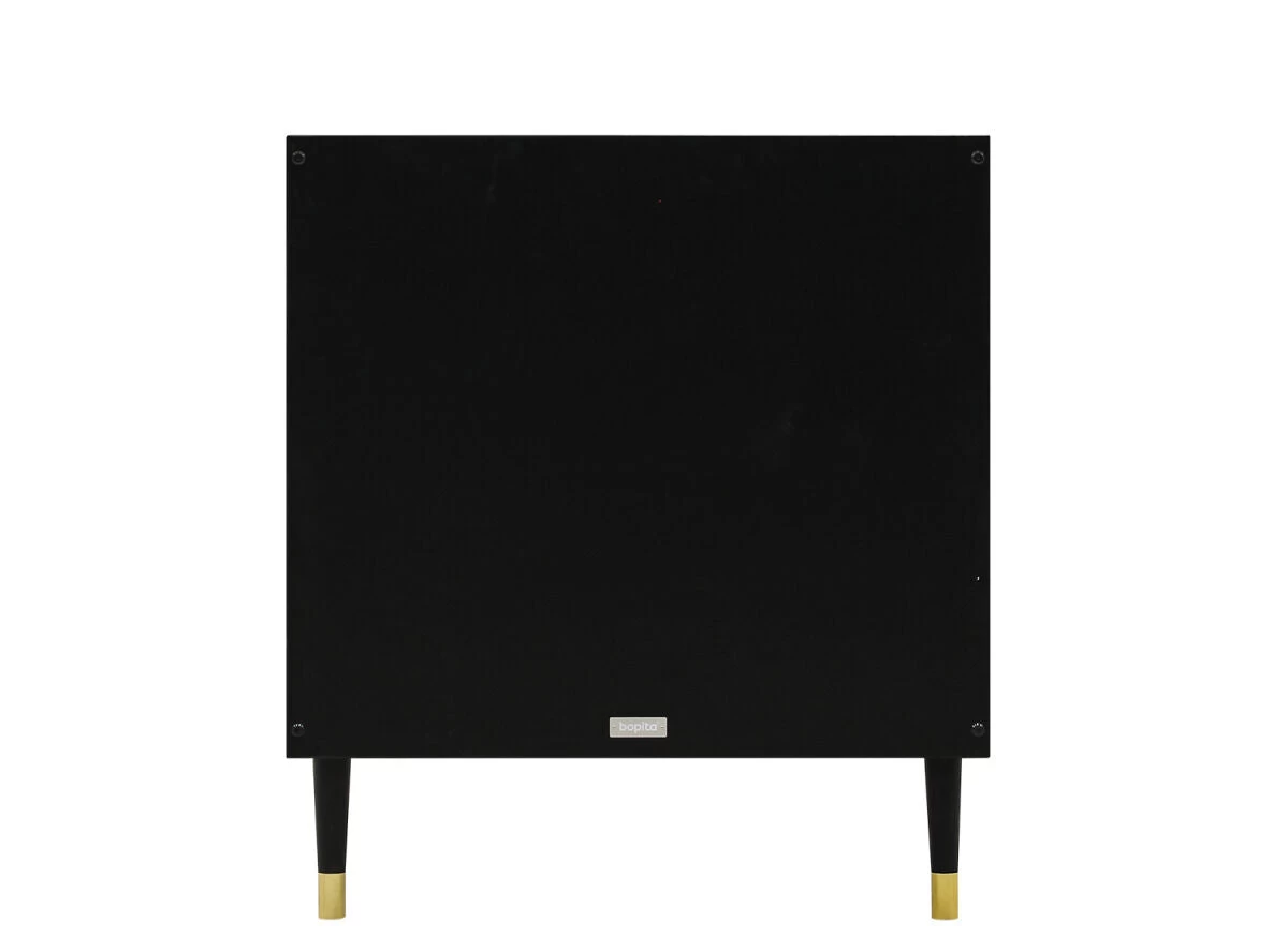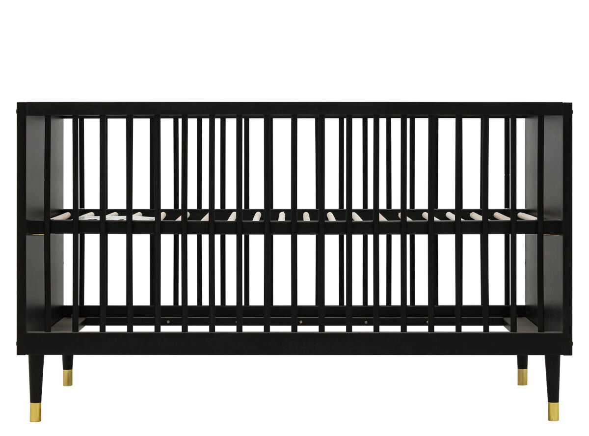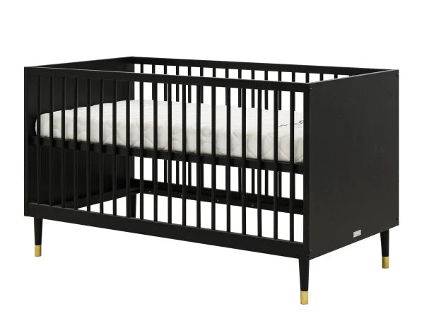 This bed (70 x 140 cm) from the series Cloë can be converted from a bed with bars to a bench bed. The combination of gold accents and matte black gives Cloë a warm, luxurious look. Bed bottom, side rack, and lower side for the bench bed are included. Bed bottom of the bed with bars is adjustable in height. The size, 70 x 140 cm, is the same for both beds so that one mattress is sufficient. Note: this bed can not be converted to a cotbed variant, there is always one bar side.