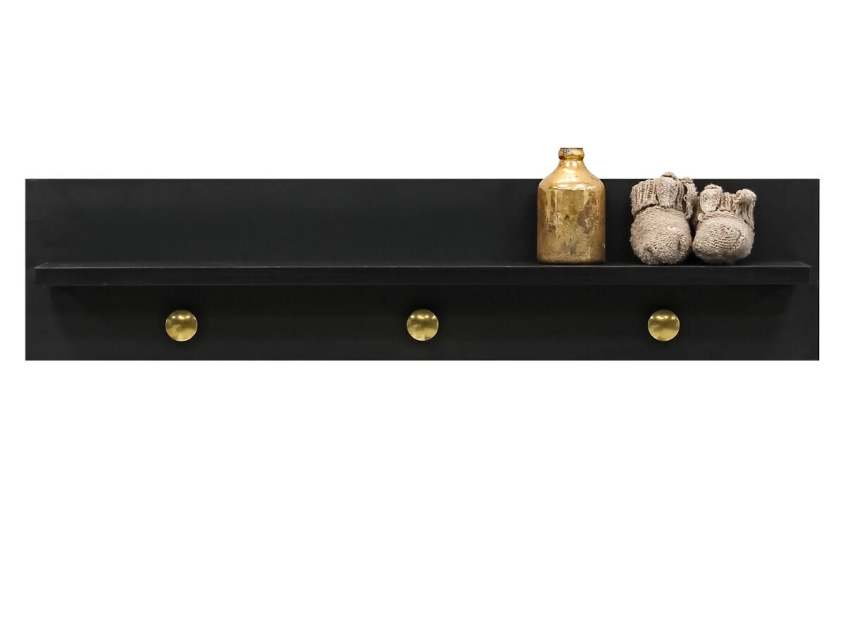 Wall rack Cloë is ideal for above the dresser to have supplies or accessories close at hand on a shelf. The combination of gold-coloured knobs and matte black gives Cloë a warm, luxurious look. This wall rack can be attached to the wall, screws not included.