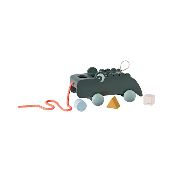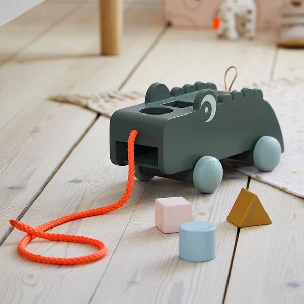 Sort the shapes and solve how they reappear from within Croco’s tummy. Then go for a walk – the warm hearted crocodile loves going places. Pull the golden loop and Croco will release the three shapes, ready for another go.