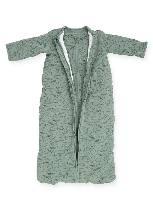 This is the perfect sleeping bag for your baby. You can easily transform it from a winter sleeping bag into a summer sleeping bag thanks to the removable sleeping bag on the inside. The two parts are attached to each other with press studs. The friendly whales print is subtle and the sleeping bag feels nice and soft. This way you ensure warm and comfortable nights and your baby is calm. The freedom of movement is limited by a sleeping bag and that gives your baby a safe feeling. Available in 3 sizes and 2 colors.