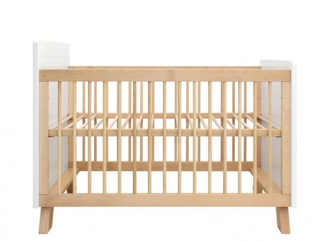 Contemporary baby bed (60 x 120 cm) with a combination of white and clear lacquered wood. Round bars and rounded corners at the head and foot ends. The bed bottom is adjustable in height, as soon as the baby can pull itself up, you can lower the bottom for extra safety.