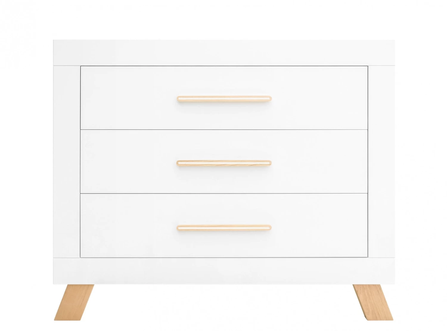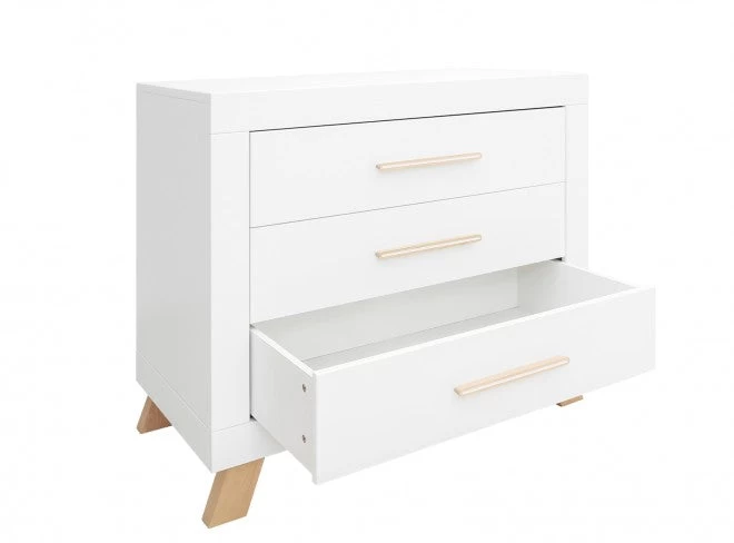 Contemporary dresser Lisa with a combination of white and clear lacquered wood. Stylish two-colored handles and slanted legs. Combine this dresser with the Lisa barrier, for safely changing and dressing the baby (sold separately).