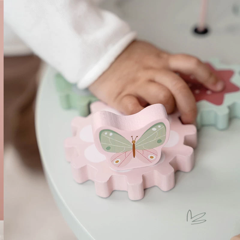 Get up and play! Discover all the activities this table has to offer. Help the butterflies move the beads back and forth along the spiral. Or build a flower tower. Complete the puzzle, turn the gears and move the bunny, caterpillar and ladybug through the flower meadow. This wooden activity table will challenge your little one in many ways. There are 5 activities to discover, each of which supports the development of fine motor skills. Thanks to its safe and balanced design, the activity table also encourages standing up. And keep it standing! Because all those play functions will keep your toddler busy for a while.