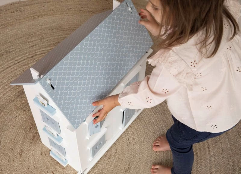 This classic Little Dutch doll’s house guarantees loads of play fun. The sturdy wooden frame has cute blue shutters and a blue roof that can be removed to show the second floor. And there is more: the roof panel is actually a garden! The house comes with 19 pieces of furniture and accessories. It also includes stickers that help you decorate the house in your own unique way.