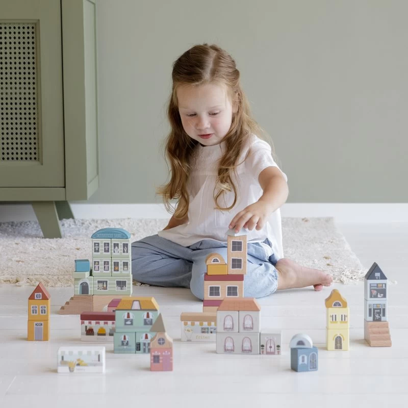 This Little Dutch’s urban-style playset is perfect to be used together with the wooden railway set. It includes 50 blocks to create town buildings, like shops, a hotel and a restaurant.